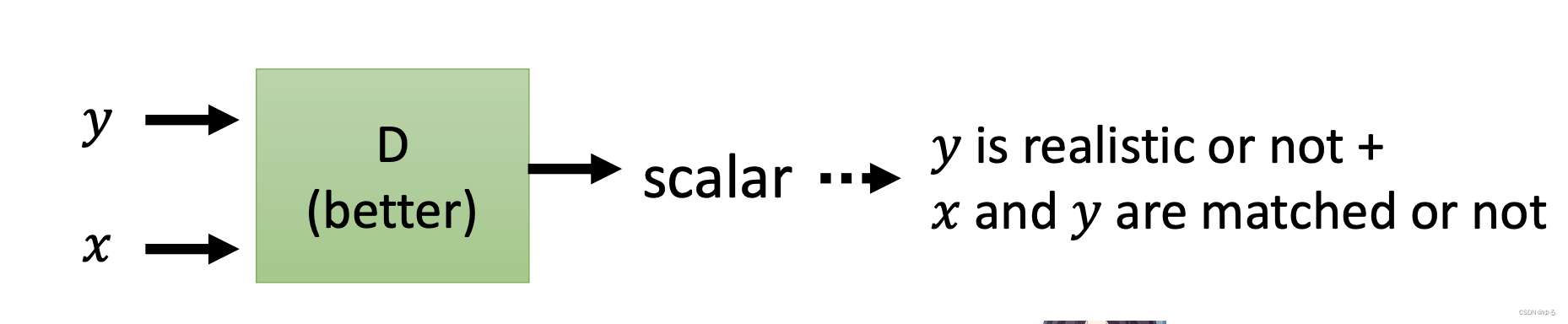 如果生成器的输入是有条件,但是discriminator只是区分生成器的输出是否是真实的对象,最终会产生不符合条件的输出。可以对discriminator进行改进,让它除了判断生成器输出是否是真实对象外,在判断一下生成器输出是否符合条件。