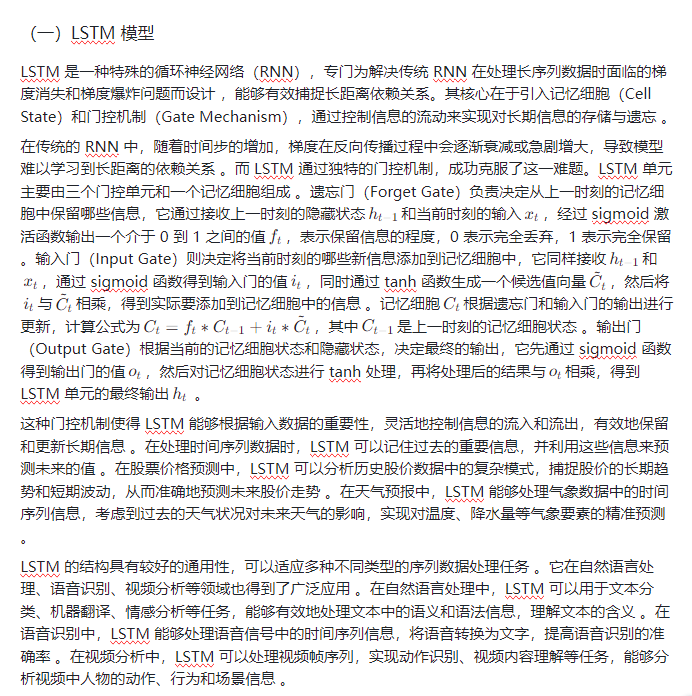 LSTM 则擅长处理时间序列数据,能够有效地捕捉时间序列中的长期依赖关系 。它通过引入遗忘门、输入门和输出门来控制信息的流动,使得模型能够记住过去重要的信息并应用于当前的预测 。在处理时间序列数据时,LSTM 可以根据历史数据的变化趋势,准确地预测未来的值 。在股票价格预测中,LSTM 可以分析历史股价数据中的复杂模式,考虑到股价在不同时间的波动情况,预测未来股价的走势 。
