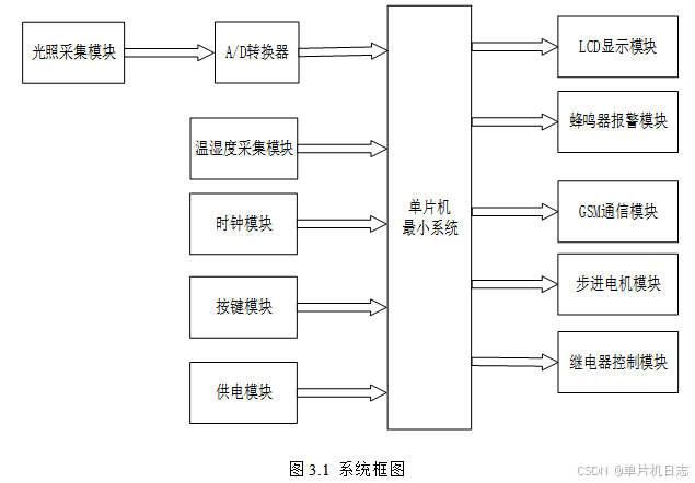 本设计以STC89C52单片机为核心控制器,加上其他模块一起组成此次设计的整个系统,其中包括中控部分、输入部分和输出部分。中控部分采用了单片机控制器,其主要作用是获取输入部分的数据,经过内部处理,逻辑判断,最终控制输出部分。输入由五部分组成,第一部分是光照采集模块,通过光敏电阻测量光照强度;第二部分是温湿度检测模块,通过DHT11检测温湿度,当温度值不在设置的上下限,则进行加热或风扇降温,并蜂鸣器报警,当湿度值低于设置最小值,则启动喷雾器,并蜂鸣器报警;第三部分是时钟检测模块,通过通过DS1302获取时间,可通过按键设置补光时间,在补光时间内且光照低于设置最小值,则启动补光,直到时间结束;第四部分是按键模块,通过该模块可以切换界面、设置阈值、切换模式等;第五部分是供电模块,通过该模块可给整个系统进行供电。输出由五部分组成,第一部分是LCD显示模块,通过LCD1602显示温湿度、光照值、时间;第二部分是蜂鸣器报警模块,当温度值不在设置的上下限,则进行加热或风扇降温,并蜂鸣器报警,当湿度值低于设置最小值,则启动喷雾器,并蜂鸣器报警;第三部分是GSM通信模块,通过GSM,可发送“温度过低,加热中”、“温度过高,降温中”、“湿度过低,加湿中”、“光照过低,补光中”、“光照过高,遮光中”;第四部分是步进电机控制模块,通过该模块控制系统进行加热或风扇降温。第五部分是继电器控制模块,通过该模块控制系统对应功能的操作。具体系统框图如图3.1所示。