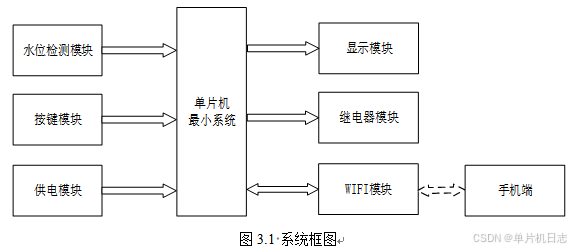 本设计以单片机为核心控制器,加上其他模块一起组成此次设计的整个系统,其中包括中控部分、输入部分和输出部分。中控部分采用了单片机控制器,其主要作用是获取输入部分的数据,经过内部处理,逻辑判断,最终控制输出部分。输入由三部分组成,第一部分是水位检测模块,通过该模块进行液位检测;第二部分是按键模块,通过该模块可以切换界面、设置阈值、切换模式等;第三部分是供电模块,通过该模块可给整个系统进行供电。输出由两部分组成,第一部分是显示模块,通过该模块可以显示监测的数据以及设置的阈值;第二部分是继电器模块,通过一个继电器控制加水。除此之外,WIFI模块既作为输入又作为输出,WiFi模块和手机进行连接,可以将监测的数据传输到用户手机端,用户也可以通过手机端发送指令控制继电器的工作及其模式的切换。具体系统框图如图3.1所示。