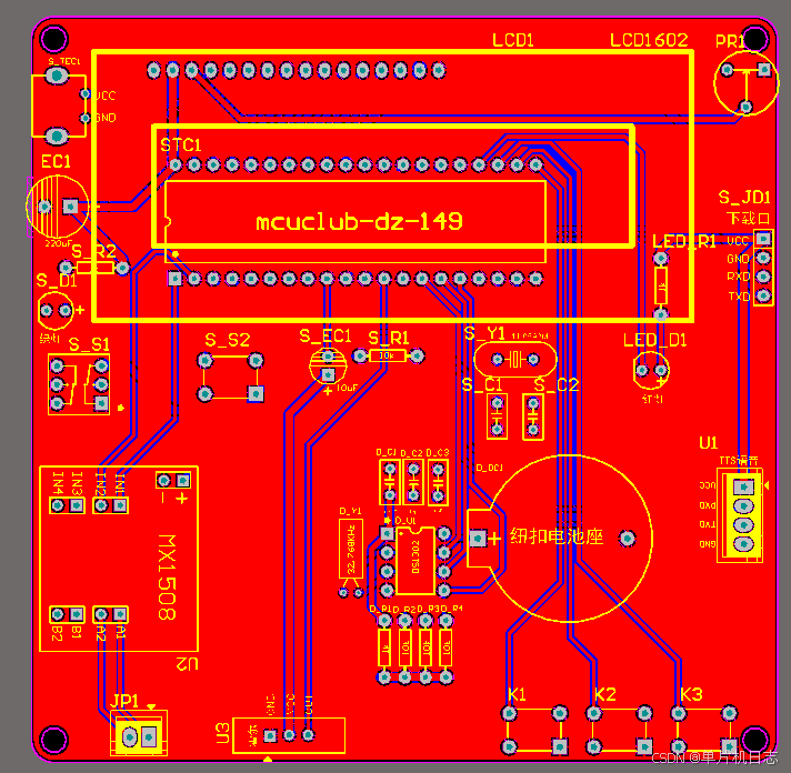 由原理图导出,封装很大一部分都是作者自己绘制,不提供封装库,只提供连接好的源文件。中间有一个项目编号,隐藏在单片机底座下,插入单片机后不会看到。