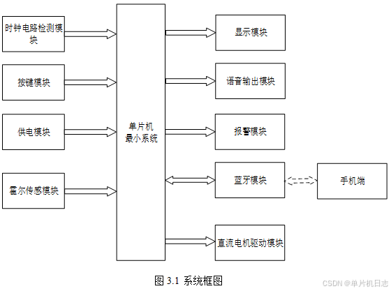 本设计以单片机为核心控制器,加上其他模块一起组成此次设计的整个系统,其中包括中控部分、输入部分和输出部分。中控部分采用了单片机控制器,其主要作用是获取输入部分的数据,经过内部处理,逻辑判断,最终控制输出部分。输入由四部分组成,第一部分是时钟检测模块,通过该模块检测时间;第二部分是按键模块,通过该模块可以切换界面、设置阈值、切换模式等;第三部分是供电模块,通过该模块可给整个系统进行供电。第四部分是霍尔传感器模块,通过该模块输获取速度值。出由四部分组成,第一部分是显示模块,通过该模块可以显示监测的数据以及设置的阈值;第二部分是语音输出模块,当监测值不在设置的阈值内时进行语音报警。第三部分是声光报警模块,当监测值不在设置的阈值内时进行声光报警。第四部分是直流电机驱动模块,通过该模块驱动电机,除此之外,蓝牙模块既作为输入又作为输出,蓝牙模块和手机进行连接,可以将监测的数据传输到用户手机端,用户也可以通过手机端发送指令控制电机的驱动。具体系统框图如图3.1所示。