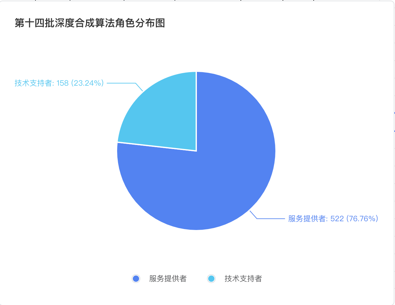 截至 2025 年 11 月,国家网信办发布的前14批深度合成算法备案中,累计通过 5100 款,其中:服务提供者 3931 款(77.1%);服务技术支持者 1169 款(22.9%)