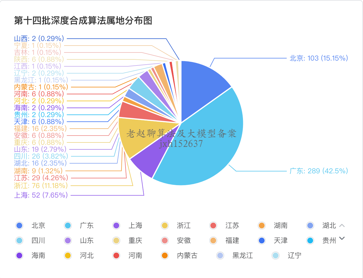 属地 算法数 占比 备注(代表企业) 广东 289 42.5% 深圳 201、广州 78;含腾讯(微保)、平安、顺丰、货拉拉、明源云、 OPPO 小布等 北京 103 15.1% 百度(文心政务)、京东(京医千询)、360、字节(InfoSeek)、小米、中国移动研究院等 浙江 76 11.2% 阿里系(支付宝“探一下”)、网易、咪咕新空、菜鸟、连连数字等 上海 52 7.6% 米哈游、饿了么、陆基金、兴业证券、商汤(SenseChat)等 江苏 29 4.3% 思必驰、同元软控、钟吾大数据集团 其他 11 省 31 4.5% 四川、山东、福建、湖南、湖北、河南、重庆等 -