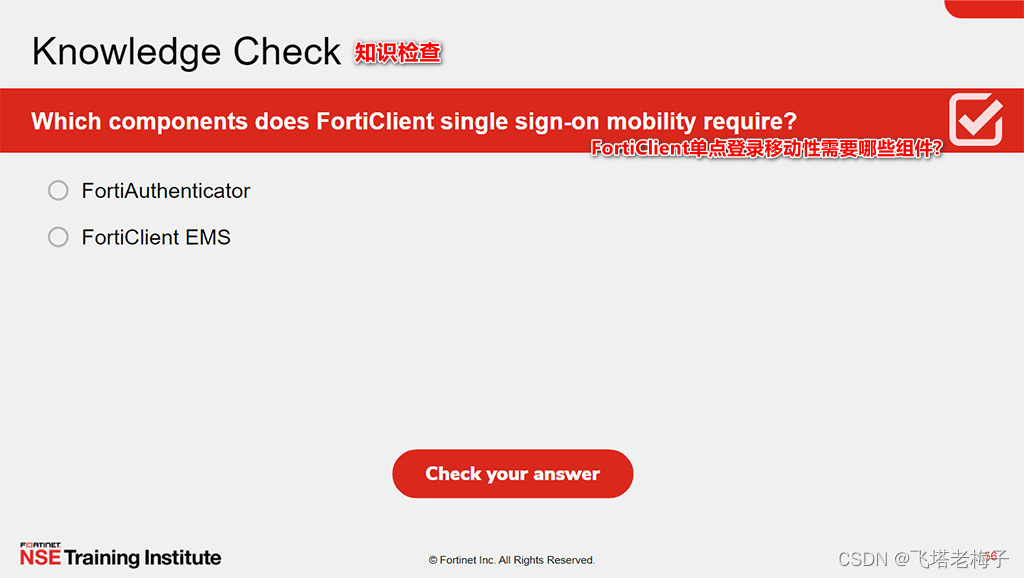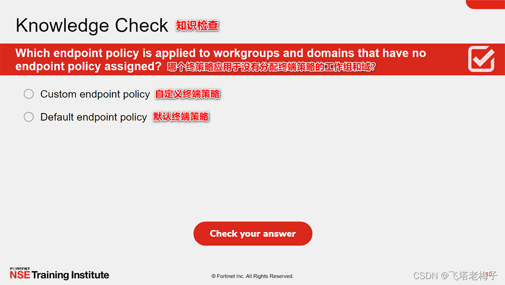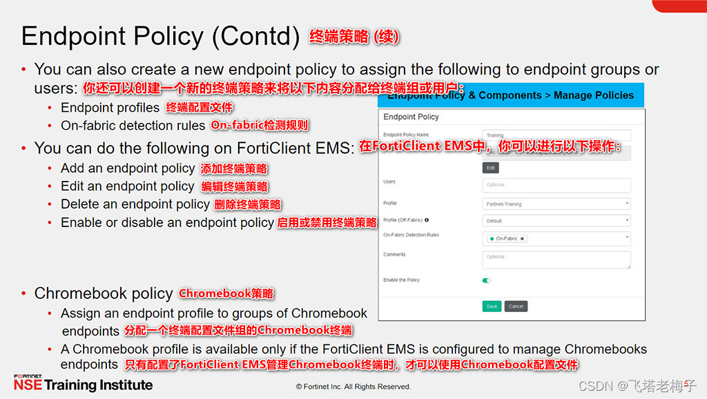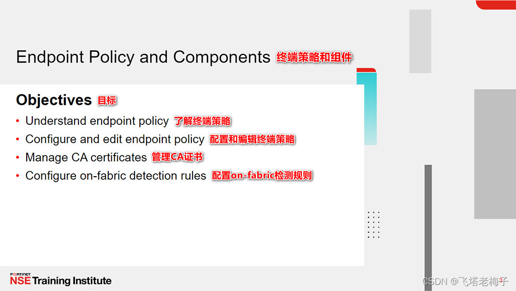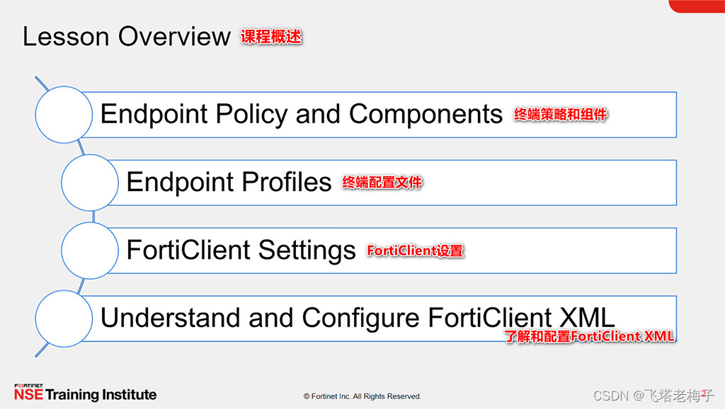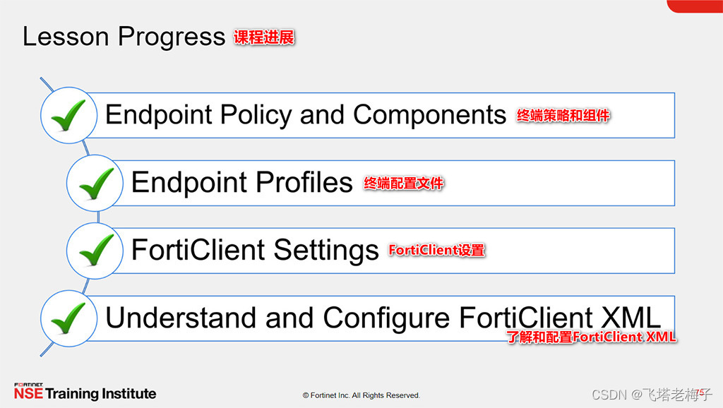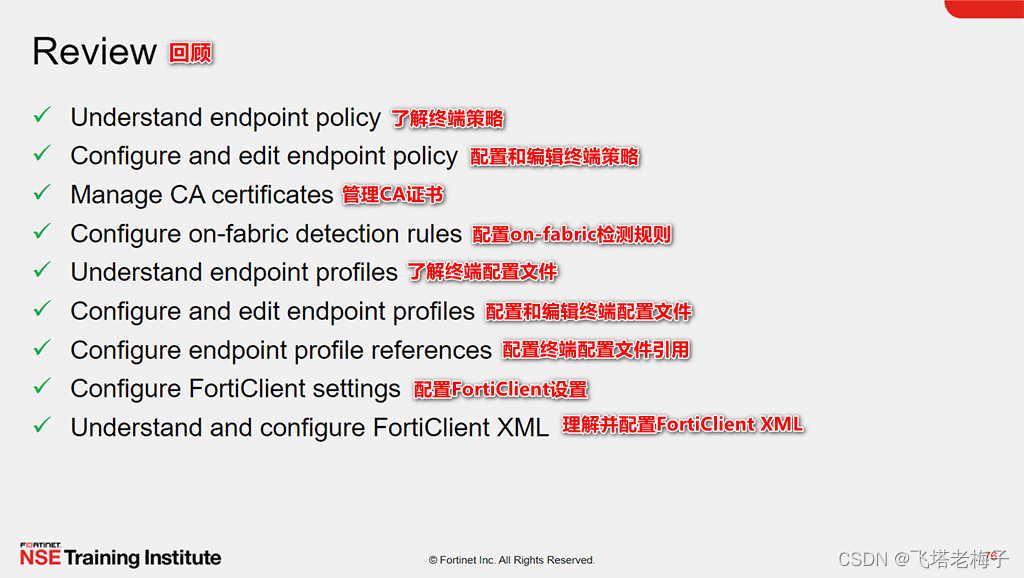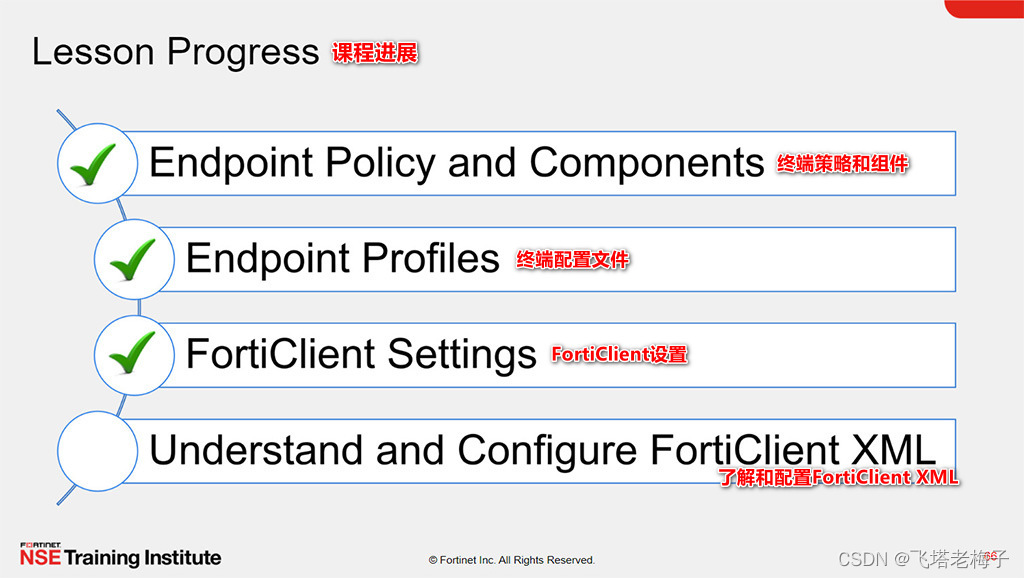 本节课中你学习了如何使用FortiClient EMS终端策略和组件、配置文件、配置文件的引用,以及更多。你还了解了FortiClient设置和XML配置。