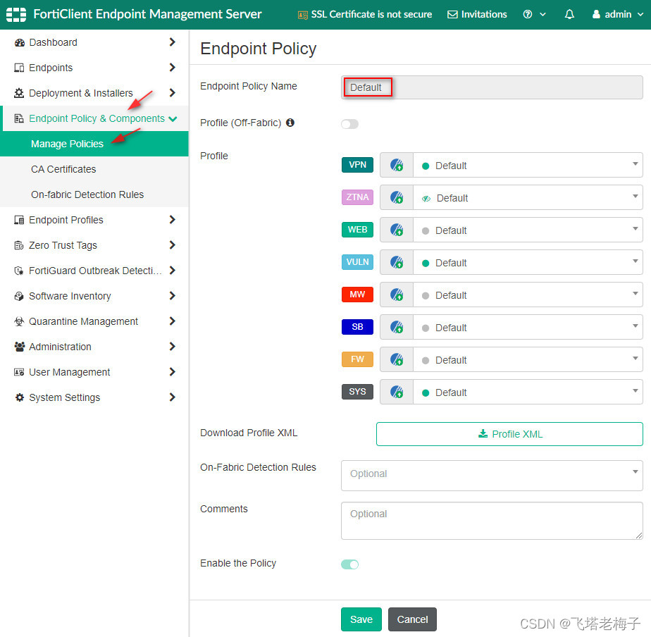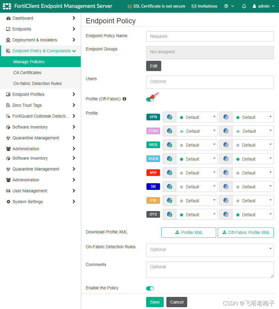 ● 只有在“终端策略和组件管理策略”页面上启用终端策略时,FortiClient EMS才会对终端应用终端策略。