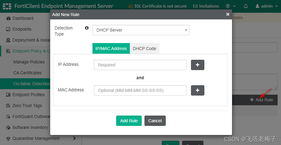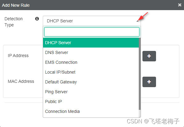DHCP服务器可以配置DHCP服务器的IP地址或MAC地址,也可以同时配置DHCP服务器的MAC地址和IP地址。还可以配置DHCP码。DHCP代码是FortiOS 6.0中的选项224的同义词,这是FortiGate的序列号。现在,DHCP代码可以是在DHCP服务器中作为选项224配置的任何字符串。如果需要,你仍然可以使用FortiGate序列号作为DHCP代码。在forclient EMS中,如果终端连接的DHCP服务器与指定的配置匹配,则认为终端满足规则。可以配置多个IP地址、MAC地址和DHCP代码。选择DNS服务器时,如果终端连接的DNS服务器与指定的配置匹配,则视为该终端满足规则。可为DNS服务器配置多个IP地址。