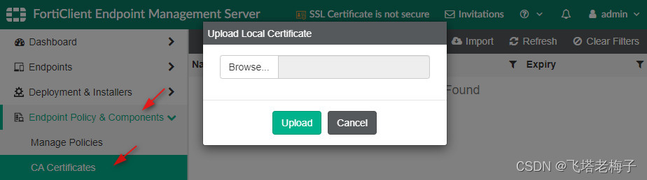FortiClient EMS支持上传或导入CA证书。你可以通过浏览本地pc上的CA证书文件,手动上传证书。或者,你也可以从FortiGate导入证书。你将需要提供FortiGate IP地址、VDOM信息和登录凭证。
