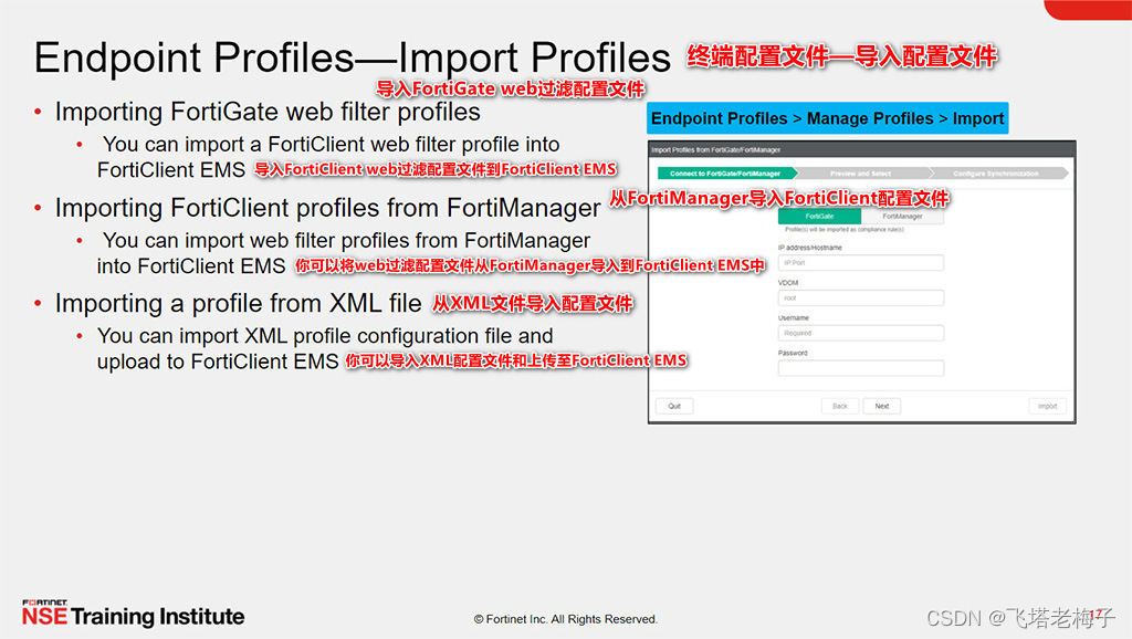 你可以从FortiGate和FortiManager设备中导入FortiClient web过滤配置文件到FortiClient EMS中,然后在FortiClient EMS中编辑该配置文件,以添加FortiClient安装程序或其他配置细节。