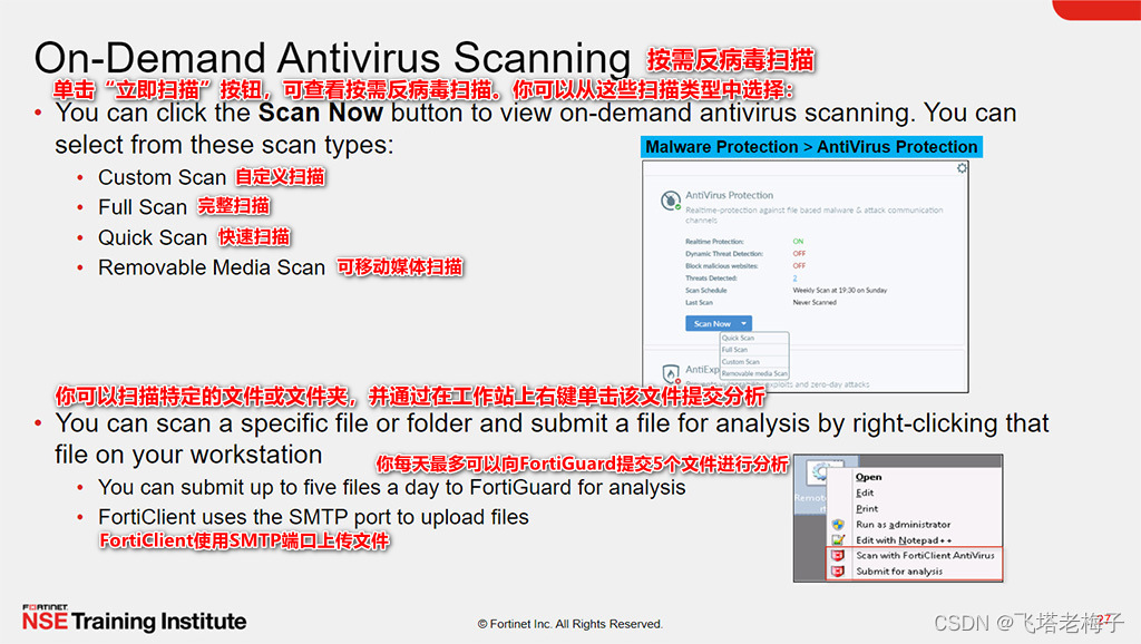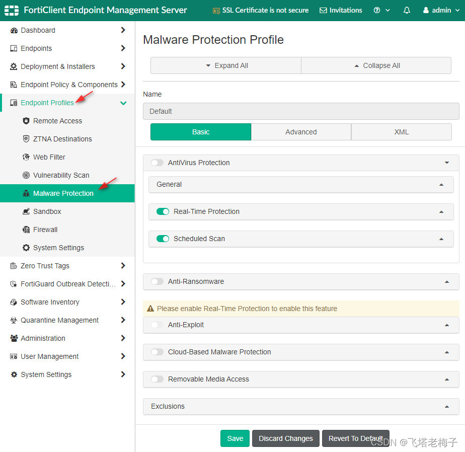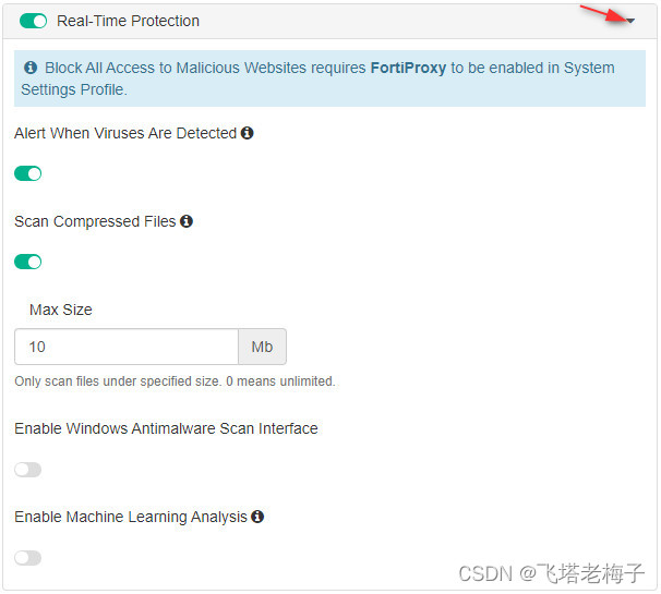 你可以查看实时保护状态、查看数据库是否最新或按需进行反病毒扫描。在FortiClient EMS默认终端配置文件中,默认关闭恶意软件保护功能。
