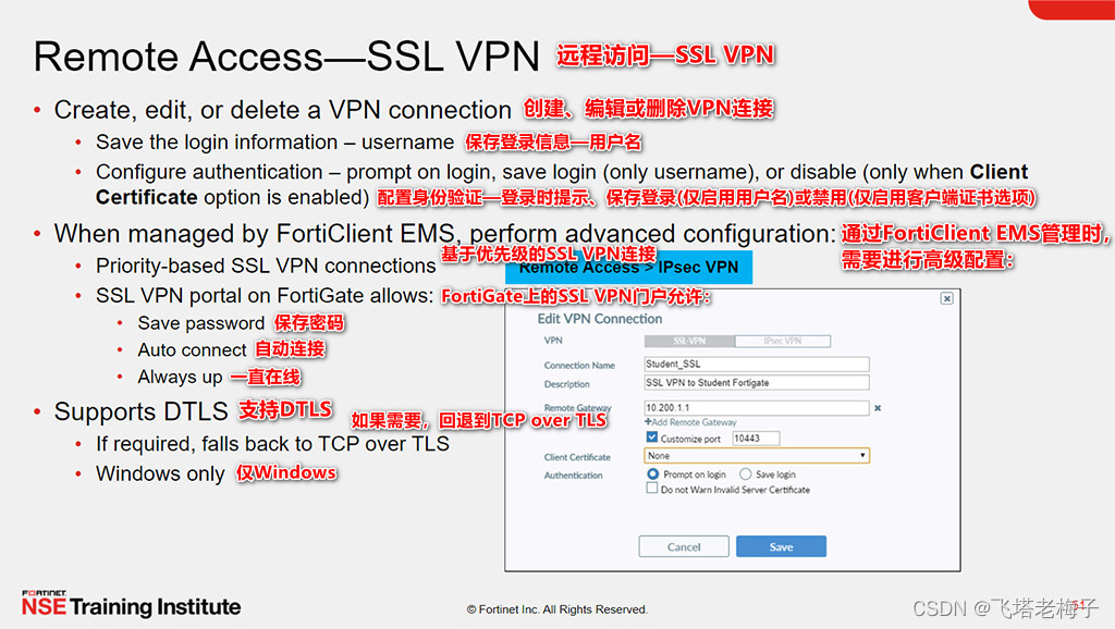 DTLS是一个仅适用于windows的特性,不建议用于较慢的网络。在FortiGate SSL VPN设置中也必须启用DTLS设置。