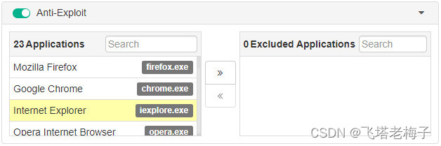 反利用选项使反利用引擎能够监视常用的应用程序,以发现利用已知漏洞的企图。你可以排除应用程序从反利用检测和启用系统托盘通知。