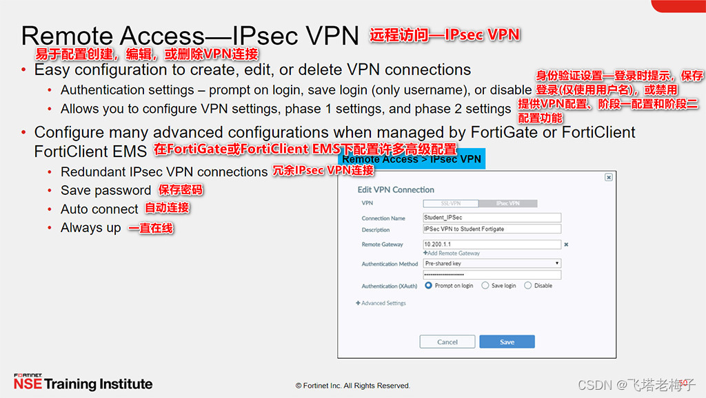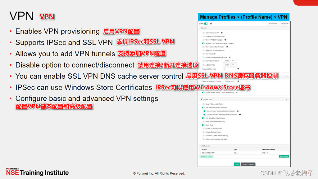 当FortiClient EMS管理员不允许使用个人VPN时,通过“端点配置文件VPN”页签可以提供这些配置,以及一些高级配置,如冗余IPsec VPN连接、保存密码、自动连接、一直在线等。