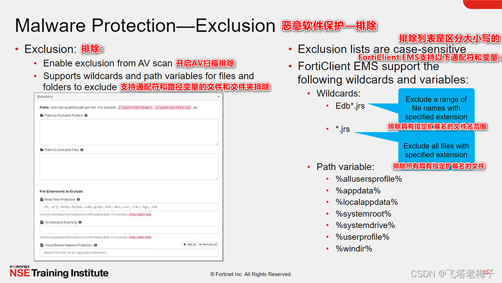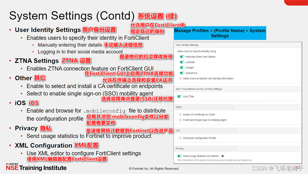 本文详细介绍了如何使用FortiClientEMS管理终端策略、配置文件和设置,包括创建、编辑和分配策略,配置反病毒、Web过滤、应用防火墙等功能,以及设置SSL和IPSec VPN。此外,还讲解了如何使用XML编辑器进行自定义配置,以及FortiClient的终端控制和零信任网络访问设置。内容涵盖了从基础到高级的多个方面,旨在确保终端的安全和管理效率。