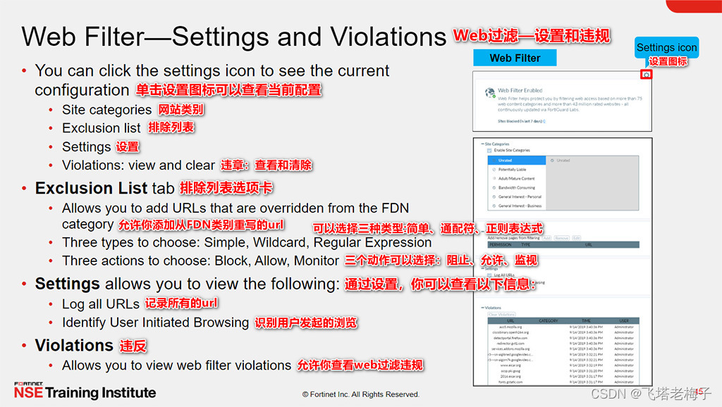 你可以查看站点违规信息和违规详情,包括网站名称、类别、日期和时间、用户名。只有当操作设置为阻止或警告FortiGuard站点类别,并阻止排除列表时,违规才会显示。