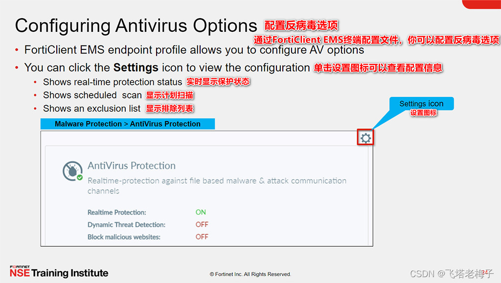 如你所知,FortiClient安全功能是通过FortiClient EMS授权的。没有联系到FortiClient EMS,这些功能就消失了。只能在FortiClient EMS终端配置文件中配置反病毒选项进行修改。