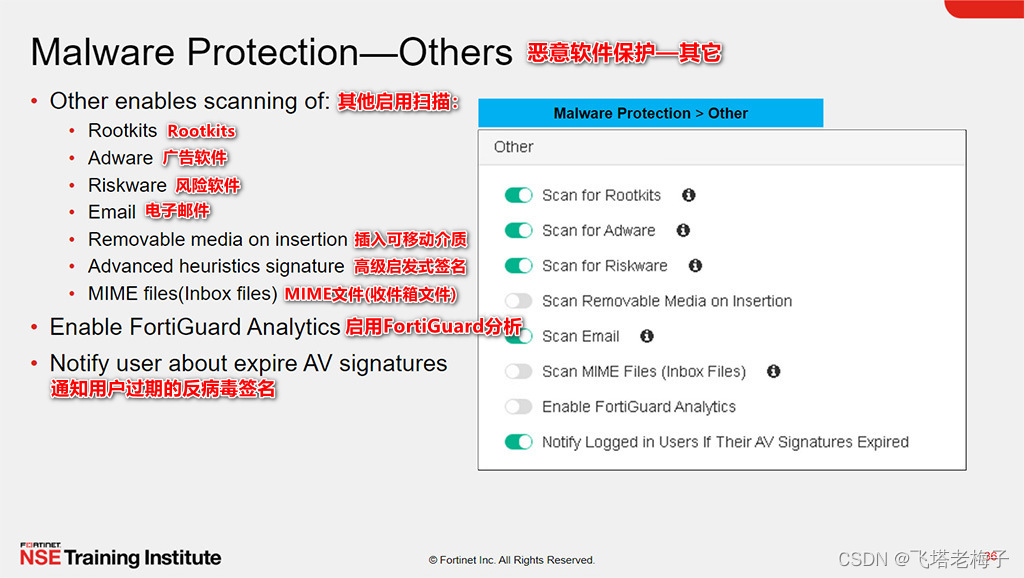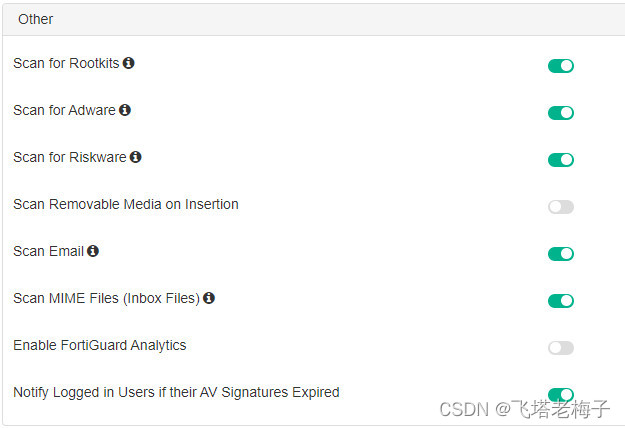 在一般设置中,你可以启用或禁用一些选项,这些选项将阻止与已知通道的通信,阻止对恶意网站的访问,并使用FortiSandbox的签名识别恶意软件和漏洞。