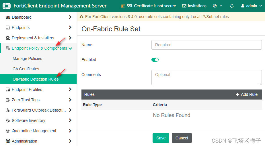 可以为终端配置fabric上的检测规则。FortiClient EMS使用这些规则来确定终端是on- fabric还是off-fabric。根据终端在fabric上的状态,FortiClient EMS可能应用不同的配置文件到终端,如应用终端策略中配置。一个规则集可以用于fabric检测。