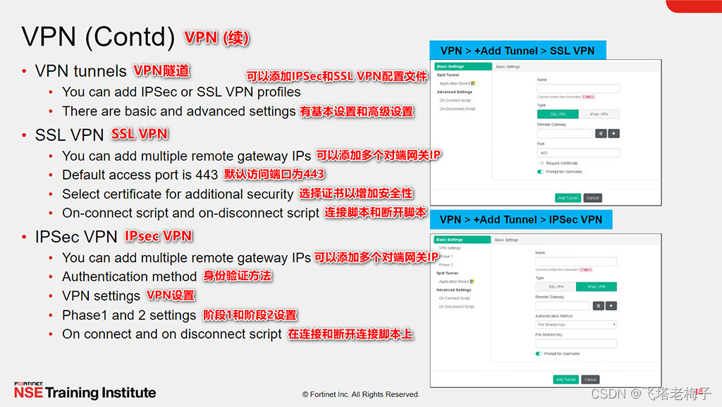 SSL VPN的配置与IPsec类似,即隧道的一端配置,另一端在FortiGate上配置。