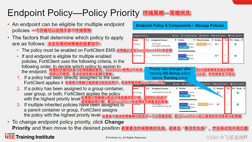 在上图的示例中,AD组TrainingAD同时适用于Training和AD-group策略。在此场景下,FortiClient EMS将第一个符合条件的终端策略“培训”应用于AD组,因为该终端策略的优先级最高。为了对终端应用更严格的策略(AD-Group),管理员必须移动策略,使其具有比Training策略更高的优先级。