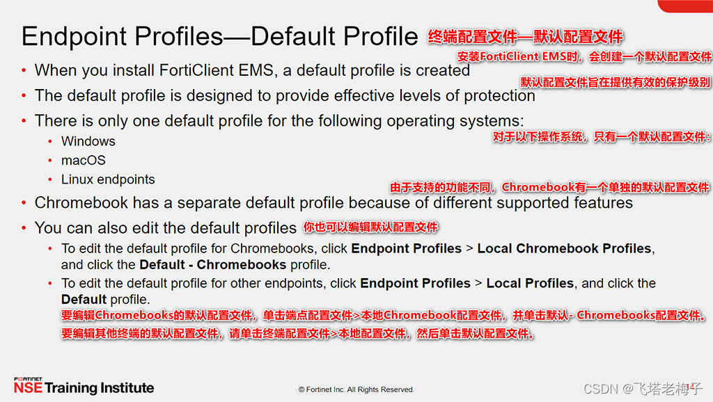 安装FortiClient EMS时,会创建一个默认配置文件。默认情况下,此配置文件应用于你创建的任何组。缺省配置文件旨在提供有效的保护级别。Windows、macOS和Linux终端以及Chromebook终端都有单独的默认配置文件。