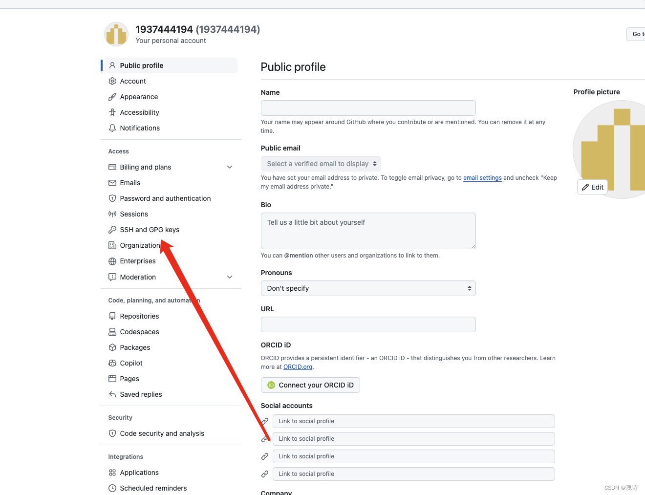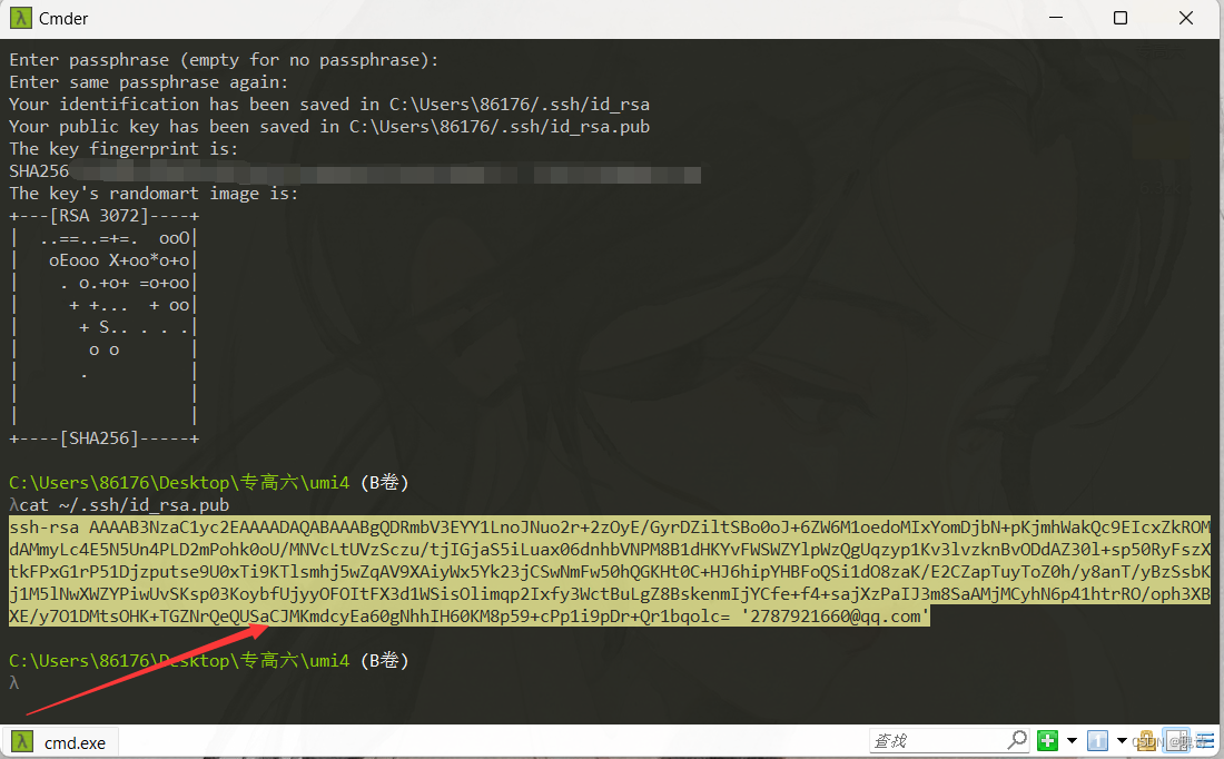cat ~/.ssh/id_rsa.pub // 打开公钥, 拷贝所有内容