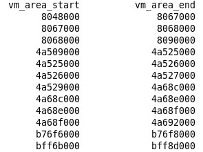 - printk("%20s %20s/n" , "vm_area_start" , "vm_area_end" );