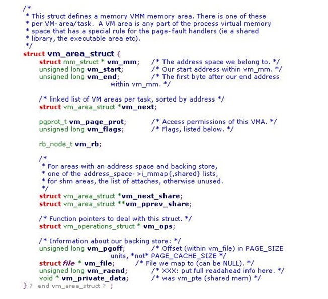 vm_start域指向线性区域的首地址,vm_end域指向尾地址之后的第一个字节,也就是说,vm_start是线性区域的开始地址,vm_end是线性区域的结束地址。vm_mm域指向和VMA 相关的mm_struct结构体,注意每个VMA对其相关的mm_struct结构体来说都是唯一的,所以即使两个独立的进程将同一个文件映射到各自的地址空间,他们分别都会有一个 vm_area_struct结构体来标志自己的内存区域;但是如果两个线程共享一个地址空间,那么他们也同时共享其中的所有vm_area_struct结构体。