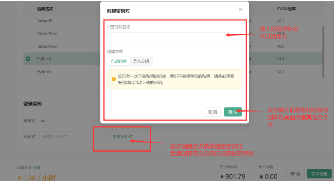 在实例创建页面的最后一部分,您需要创建一个密钥对来确保本地连接的安全性。点击“创建密钥对”,输入自定义的名称,系统将为您生成一个私钥。请将该私钥下载到本地并重命名为.pem文件,之后您将通过此文件来连接实例。