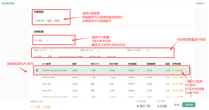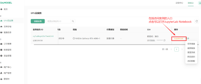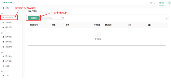 首先,进入DAMODEL的控制台,导航至“资源-GPU云实例”界面,点击“创建实例”,系统会引导您进入实例配置页面。
