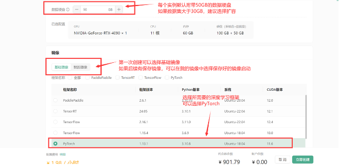 接下来,选择GPU的型号与数量。新用户可以选择NVIDIA GeForce RTX 4090的单卡配置。该配置提供60GB内存和24GB的显存,足以支持绝大多数AI训练任务。这个配置既能满足模型训练的需求,又能控制成本,适合新手尝试。