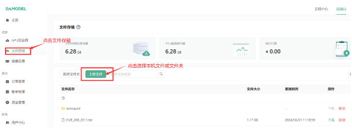 DAMODEL提供了20GB的免费存储空间,用户可以将数据上传到共享存储目录(/root/shared-storage),该目录能够在多个实例之间共享数据。下面是数据上传的操作步骤: