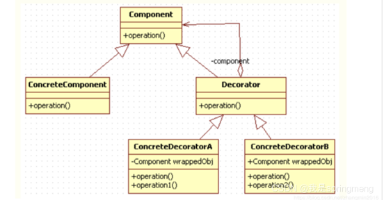 装饰器模式属于结构型模式,在不改变原有对象的基础上将功能附加到对象,相⽐继承可以更加灵活地 扩展原有对象的功能。