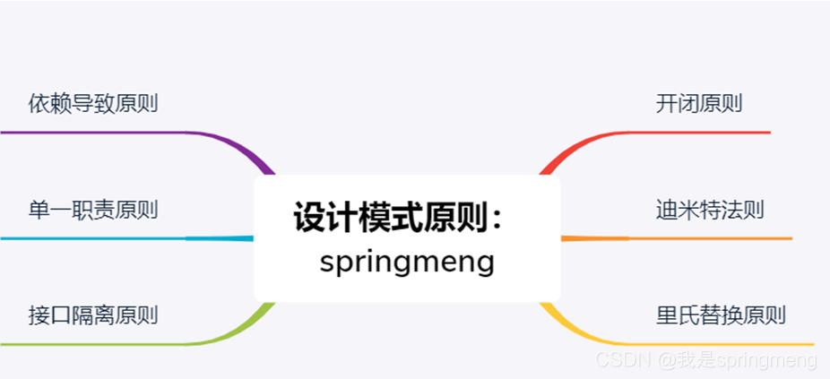 通常来说设计模式的原则有依赖导致原则、单一职责原则、接口隔离原则、开闭原则、迪米特法原则、里氏替换原则。设计模式原则图如下所示: