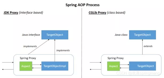 Spring 利⽤动态代理实现 AOP,如果 Bean 实现了接⼝就使⽤ JDK 代理,否则使⽤ CGLib 代理。