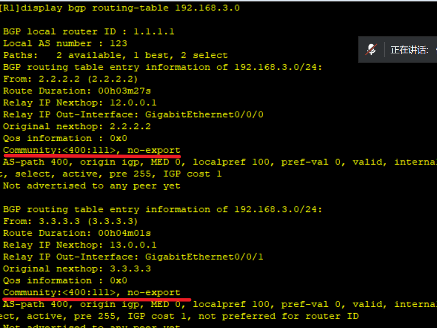- 自定义 Community 策略:对 192.168.3.0/24 路由设置自定义 Community 属性,使该路由不发布到 AS 500 ,通过设置特定 Community 值,结合路由过滤规则实现。