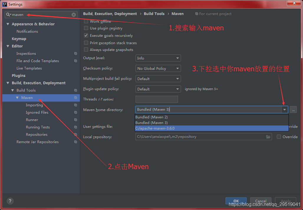 因为我之前做过配置,因此只需要改变框1的路径,如第一次配置需要自己找到你maven放置的位置,以及settings.xml,repository的位置,实在不会的百度 maven集成idea。