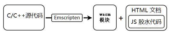 实际中常用的是Emscripten,他可以将C和C++应用程序移植到WebAssembly,原生C/C++代码编译为两个文件.wasm文件和.js文件。
