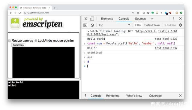 现在我们启动Web服务器,一旦页面打开,在控制台中调用Module.ccall Module.ccall('hello', 'number', null, null),结果会打印 "Hello World!"并返回8: