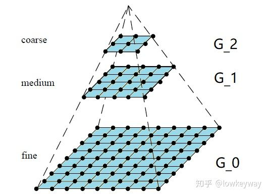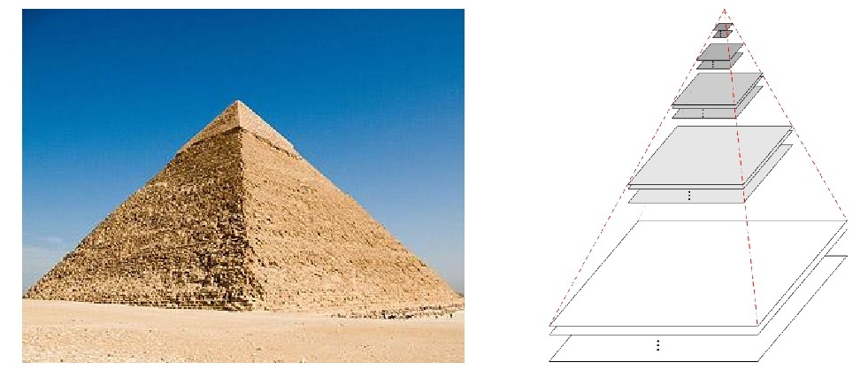 图像金字塔是图像多尺度表达的一种,是一种以多分辨率来解释图像的有效但概念简单的结构。一幅图像的金字塔是一系列以金字塔形状排列的分辨率逐步降低,且来源于同一张原始图的图像集合。其通过梯次向下采样获得,直到达到某个终止条件才停止采样。我们将一层一层的图像比喻成金字塔,层级越高,则图像越小,分辨率越低。
