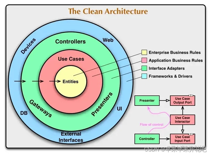 从整洁架构的架构图可以看出:整洁架构最主要的原则是依赖原则,它定义了各个层级的依赖关系,同心圆代表软件的不同领域,越往里能力越是核心。外圆代码依赖只能指向内圆,内圆无需关注外圆变化(包括函数、类。 变量,或任何其他命名的软件实体)。