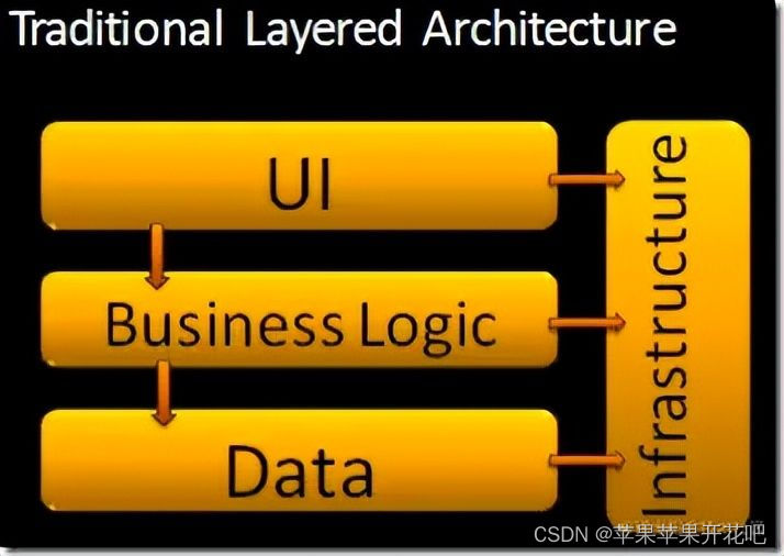 洋葱架构被提出的原因是作者觉得传统自上而下的分层架构模式存在严重的弊端弊端:耦合,每一层都耦合到它下面的层,每一层通常耦合到各种基础设施问题。下图为传统分层架构图: