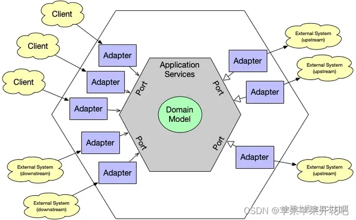 六边形架构:Hexagonal Architecture,又名“端口适配器架构”,它是由 Alistair Cockburn 于 2005 年在论文中引入的。