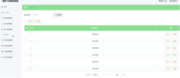 医护人员排班系统的系统管理员可以对医护类型添加修改删除以及查询操作。具体界面的展示如图5.1所示。