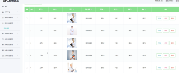 管理员可以对医护信息进行添加,修改,删除操作。界面如下图所示: