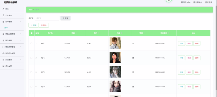 用户管理,在用户管理页面中可以通过填写用户名、密码、姓名、头像、性别、联系电话进行详情、修改,如图5-2所示。还可以根据需要对商品分类管理进行详情,修改或删除等详细操作,如图5-3所示。
