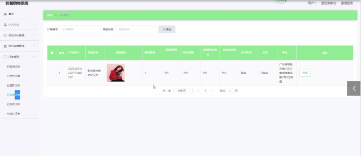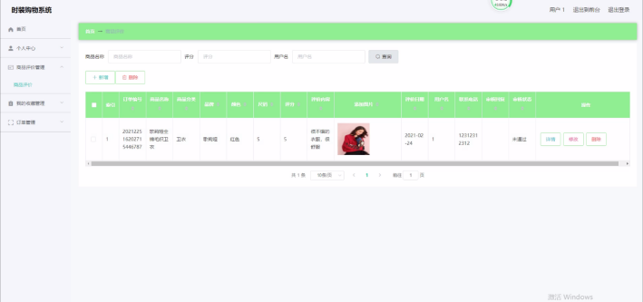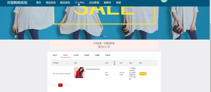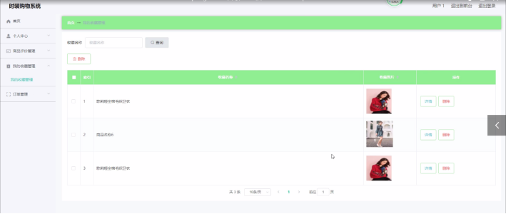用户登录进入时装购物系统可以查看首页、个人中心、商品评价管理、我的收藏管理、订单管理等内容。
