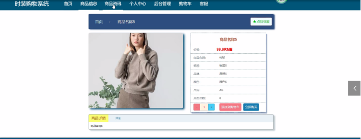 时装购物系统,在时装购物系统可以查看首页、商品信息、商品资讯、个人中心、后台管理、购物车、客服等内容,如图5-13所示。
