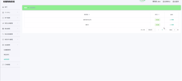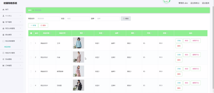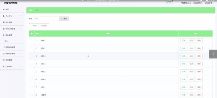 管理员登录进入时装购物系统可以查看首页、个人中心、用户管理、商品分类管理、颜色管理、商品信息管理、商品评价管理、系统管理、订单管理等信息。