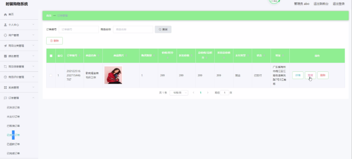 订单管理,在订单管理页面中通过填写订单编号、商品名称、商品图片、购买数量、价格/积分、折扣价格、总价格/总积分、折扣总价格、支付类型、状态、地址等内容进行详情、删除,如图5-12所示。